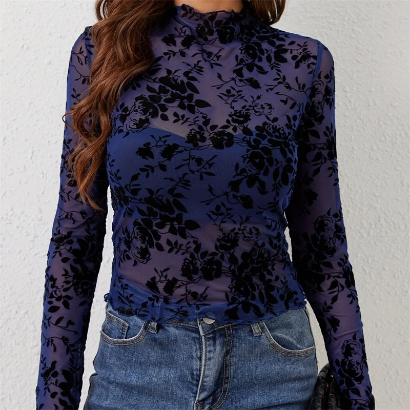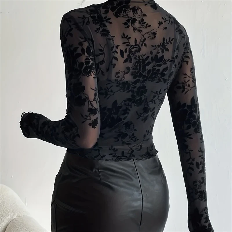 Mesh Blouses Sexy Women Clothes Sheer See Through Floral Mock Neck Long Sleeve Shirts Tops y2k Clothing Club Streetwear
